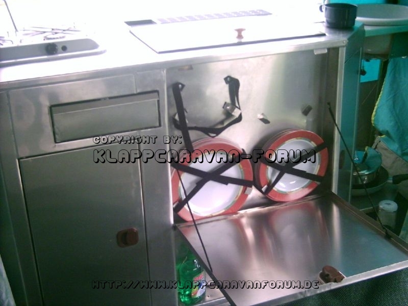 Vor dem Kühlschrank ist noch genug Platz alle Teller und die große Schüssel zu verstauen. Während der Fahrt werden die Teller mit Klettband gesichert.
