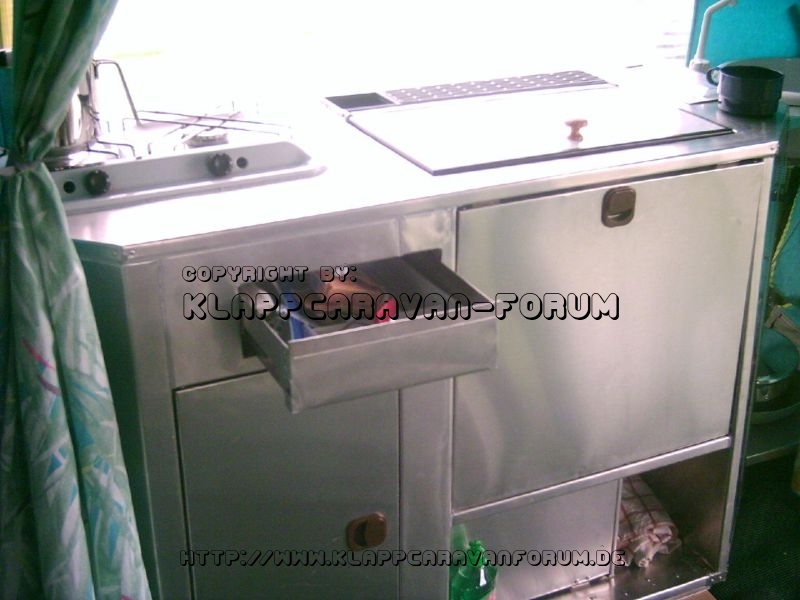Noch vergessen... hinter der Schublade das 12V Netzteil. Für die Versorgung der Beleuchtung im Vorratsschrank und der Wasserpumpe, sowie der Aufbewahrungsplatz für das 230V Stromkabel. Das 12V Stromkabel liegt im Fach für den Abwassertank, die Küche kann so auch über die Autobatterie betrieben werden. Und die Schublade für Besteck und Kleinkram ist natürlich gegen unbeabsichtigtes öffnen gesichert.