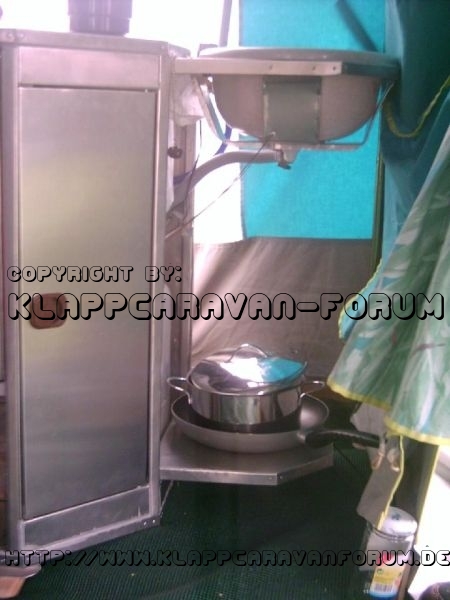 Spülbecken mit Wasserhahn und Pumpe darunter Stellfläche für Pfanne und Topf. Links daneben ist der Frischwassertank und im Schrank befinden sich die Tassen und die kleine Schüssel.
