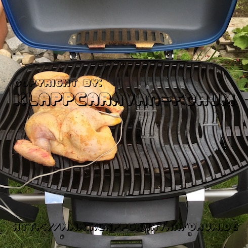 Fest auf dem Scherenwagen montierter Gasgrill, der normalerweise mit Kartuschen betrieben wird. Kann aber über einen Adapter an eine handelsübliche Gasflasche angeschlossen werden.