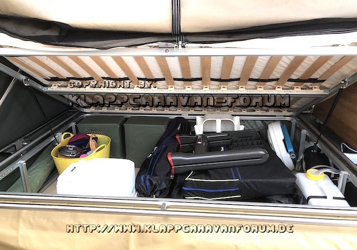 Das ist der Stauraum unterm Bett beim Kyte - die Gebläse für das Pustefix nehmen schon einiges an Patz weg, aber obwohl wir 2 Tische, 6 Faltstühle, ein Kinderstuhl und einen Faltschrank dabei haben ist echt noch gut Platz für Grill und Gasflasche und was man so braucht mit Kindern.