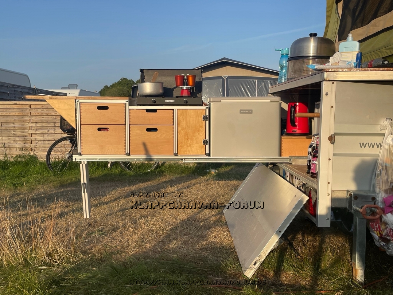 Campingküche aus Aluprofilen 20x20mm auf Teleskopschienen. Multiplexplatte Birke als Arbeitsplatte und Pappel als Wände zwischen den Aluprofilen. Boxen aus Buchenholz vom Bauhaus als Schubladen.