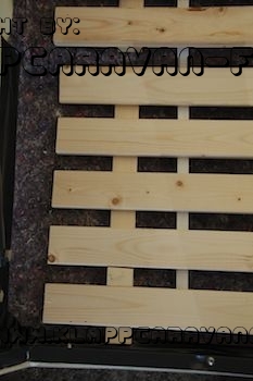 Da mir das Original-Latenrost des Camplet zu teuer ist, habe ich mir eines bei OTTO für 45 Euro bestellt. Dazu noch zwei je 2m lange Leisten (18x43 mm) zu je 1,50 Euro und 38 Spanplattenschrauben (4,5x40 mm). Ich habe die Böden auf beiden Hälften des Camp-lets noch zusätzlich mit Malerfilz ausgelegt und mit Teppichklebeband fixiert. Wir haben den Eindruck, dass diese Maßnahme etwas schalldämmend wirkt.