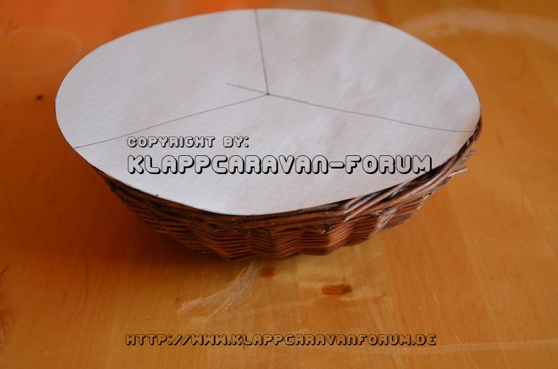 Die Körbe sollen an drei gleich langen Ketten hängen. Drei deshalb, weil dann nicht die Gefahr besteht, dass eine der Ketten etwas durchhängen könnte. Das ist wie bei dreibeinigen Tischen - die wackeln auch nie! Nach Ermittlung von Länge der Ketten und Abstand der Körbe zueinander werden die Schlüsselringe an die Ketten angebracht. Die Maße muss jeder für sich entscheiden. Dann werden die Schlüsselringe in den oberen Rand der Körbe eingedreht. Damit die Ringe immer den gleichen Abstand zueinander haben, habe ich eine Kreisschablone gebastelt, auf der drei Radien (Winkel zwischen 2 Radien: 120 Grad) aufgezeichnet sind. Das erscheint mir zuverlässiger als Augenmaß.