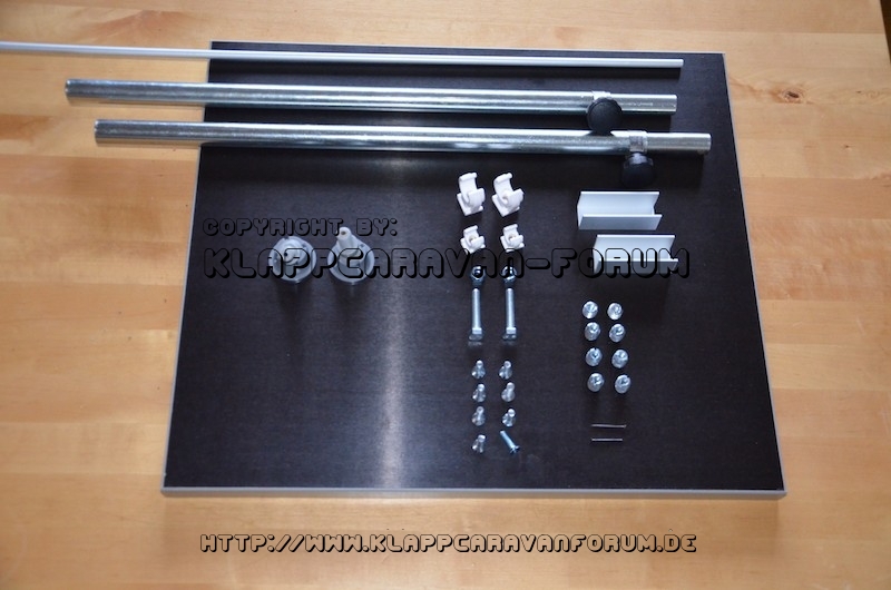 Zur Abstützung brauche ich 2 teleskopierbare Stangen. Ich habe mich für Dachauflagestangen aus Stahl 22/19mm – teleskopierbar von 80 bis 120 cm entschieden. Ich habe sie gekürzt. Neues Maß: 55 – 95 cm. Oben muss ich sie etwas zusammen drücken, weil das Alu-Profil nur ein Innenmaß von 21 mm hat. An einer Seite des oberen Endes muss die Stange noch abgerundet werden, damit sie eingeklappt werden kann. Jetzt kann die Stange mit M8-Schraube und selbstsichernder Mutter am Profil befestigt werden. Da ich schon Teile für eine meiner ersten Ideen zur Arbeitsplatte besorgt hatte, hatte ich auch schon 2 Rändelschrauben, mit denen ich jetzt die Flügelschrauben ersetzt habe. Nutzen: besseres Handling und sieht gut aus. Sämtliche Bohrungen und Senkungen wurden mit der Ständerbohrmaschine gemacht. Als Füße dienen zwei Kugelgelenkfüße, die für einen sicheren Stand sorgen, ohne den Teppich kaputt zu machen. Diese Füße sind von Eurotrail und im Durchmesser zu klein, um in der Stange zu halten. Die Gewinde der Füße habe ich deshalb stramm mit Leukoplast umwickelt. Jetzt sind sie so stramm drin, dass ich sie mit einer Zange reindrehen musste.