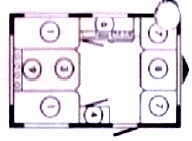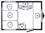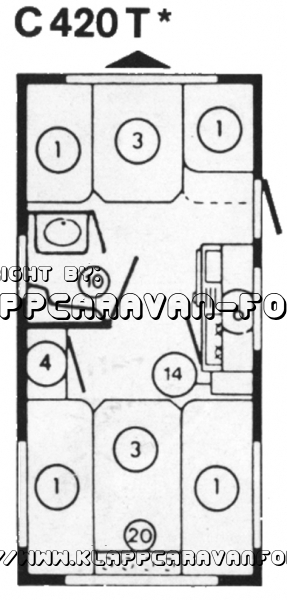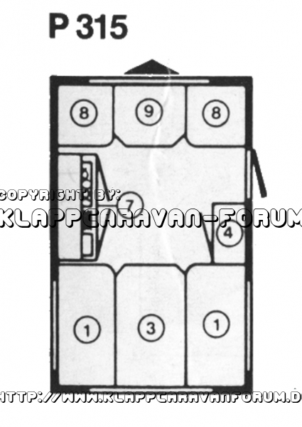 Kein Kuhlschrank, nur Standard Einteilung (4er Sitzgruppe/Doppelbett hinten, 2er Sitzgruppe/Einzelbett vorne)