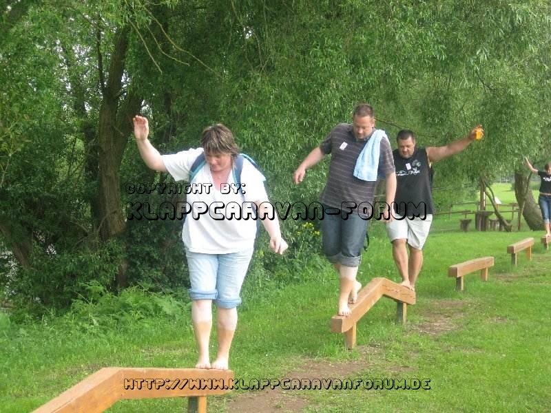Als sie dann kurz nach eins ankamen, war die Schranke des Campingplatzes schon geschlossen, so dass sie ohnehin noch nicht auf den Platz konnten. Also brach nahezu das gesamte Lager gemeinsam nach Bad Sobernheim zum Barfußpfad auf. Auf der Wanderung durch Matsch und über Stock und Stein wurden weitere Kontakte geknüpft. Gemeinsam kletterte man über manches Hindernis und wanderte unter tropfenden Bäumen längs der Nahe. Zum Schluss sammelte sich die gesamte Gruppe, die sich auf dem Weg ein wenig auseinander gezogen hatte, am Ende des Barfußpfades wieder und es wurden einiges an Eis verputzt, sowie die Füsse geswaschen. Nach der Rückkehr zum Campingplatz Nahemühle konnten Ksenia und Michael ihren Falter endlich zum Camp bringen. Dort hatten sie das zweifelhafte Vergnügen ihren Erstaufbau unter fachkundiger Beobachtung durchführen zu können.