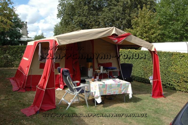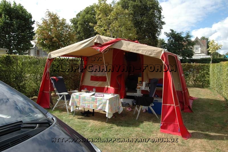 (von links nach rechts - VZ-SS-Seitenteil rechts - VZ-SS-Seitenteil links - VZ ohne Seitenteile - VZ-Frontteile-ein Seitenteil - Hauptwagen allein, Regelschnellaufbau - Dach vom Vorzelt mit SS-Gestänge aufgebaut)