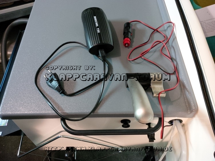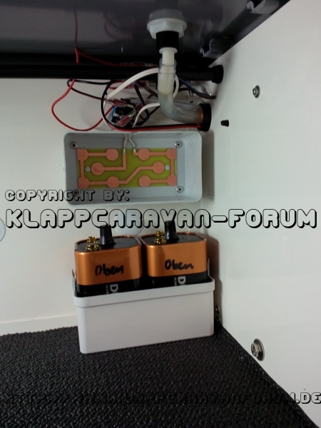 Jederzeit beide Hände können unter das Wasser geführt werden - einfach praktisch. Auch beim Zähneputzen perfekt. Wasserverbrauch optimal steuerbar. Somit hängt quasi unsere Wasserpumpe direkt am ständig eingeschalteten 12-V-Wandler, den ich an einen Dreier-Stecker mit ein- und ausschaltbaren Fußschalter angesteckt hatte. Fertig. Das angelötete Kabel im Batteriekasten wird damit von uns gar nicht benötigt; und ich spare mir mal vorläufig die Fehlersuche.