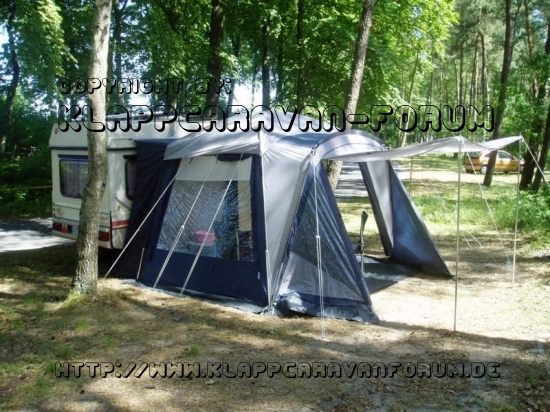 Das Dach des Vorzeltes besteht aus Fliegengaze und es wir von oben mit einem doppelten Dach abgedeckt. So ist das Vorzelt auch bei Regen gut durchlüftet und es bildet sich kein Schwitzwasser.