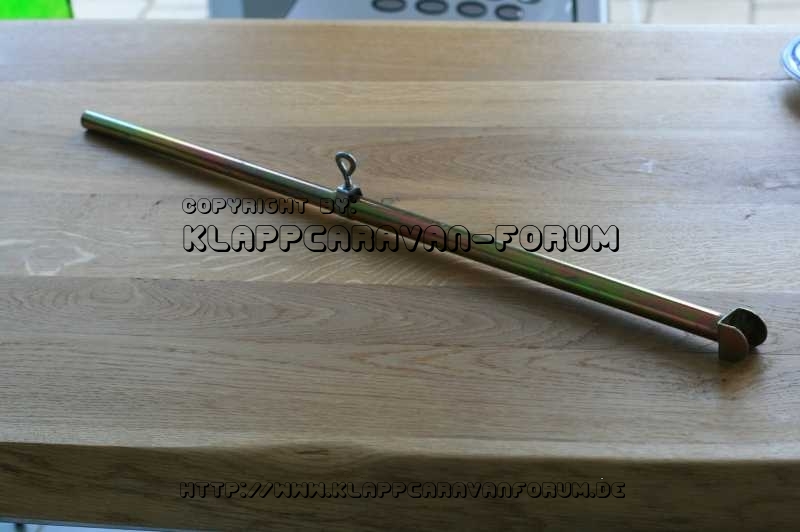 Die Stange hat an einem Ende ein U mit dem man sie rechtwinklig gegen eine andere Stange stellen kann. Sie ist ca. 50cm lang und kann auch ca. 1m ausgezogen werden. Das andere Ende ist offen.