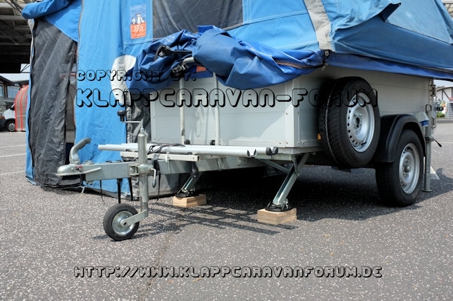 Uns ging das gleich nach dem ersten Mal gewaltig gegen den Strich. Was tun? Auch diese Idee wurde im vergangenen Jahr geboren, um unsere Klappvilla zu verbessern. Beim guten Camping-Berger bzw. Ebay werden Drehstützen aller Art angeboten. Die haben aufgrund der Unterkonstruktion des WMeier-Anhängers (vielleicht aller Anhänger) ein kleines Problem, da der Rahmenrand des Chassis im Wege steht. Also muss man erst eine entsprechend dicke Unterlage (z.B. Multiplexplatte) erstellen und dann die Drehstütze montieren. Damit kann man den 3Dog erstens stabil auf dem Untergrund parken und zweitens noch ein wenig ausrichten (wobei letzteres mit Keilen unter einem Rad besser funktioniert).