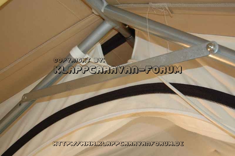 Auch auf die Gefahr, dass ich wieder Schläge bekomme, ist das für mich eine Arbeit an den teilweise aufgetretenen Symptomen unter Vernachlässigung der Ursache. Ich wiederhole mich ja ungern, aber es passt halt gerade: Unser alter Holtkamper Family brauchte den ganzen Kram nicht. Die Führung der Rohre wurde durch stabile Taschen am Zeltdach vorgenommen und so standen die Rohre immer da, wo sie gebraucht wurden. So waren weder Gurte noch Stabilisierungen erforderlich. Wie ich bereits mit Rainer und Jan diskutiert habe, wäre das aus meiner Sicht auch an den SK-Faltern möglich, auch wenn der Holtcamper ein PE-Dach hatte. Und wenn sich der Zeltstoff unter den Umwelteinflüssen dehnt oder zusammen zieht, sind die Rohre unabhängig von Querstreben oder Bändern immer noch genau da, wo sie hingehören.