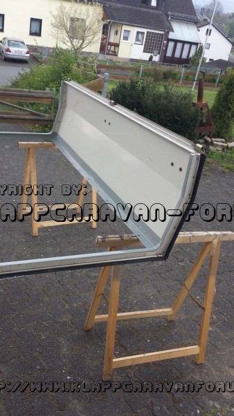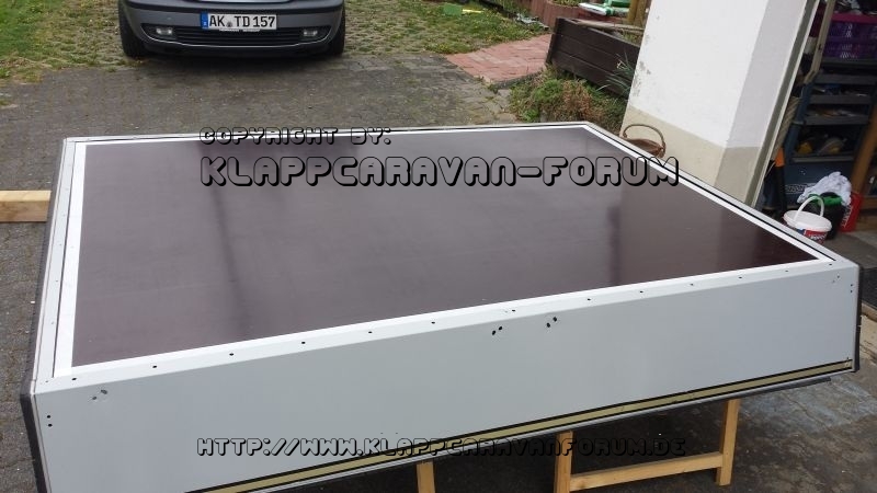 Also, meine Frau und ich haben uns zur Aufgabe gemacht, den originalen Sperrholzdeckel gegen eine 12mm Siebdruckplatte zu tauschen. Zusätzlich soll auf dem Deckel eine Verzurrmöglichkeit bestehen, um die 4 Fahrradträger sicher mitzunehmen. Da ich durch mein Engagement bei der FFW die letzten 7 Samstage keine Zeit hatte, muss halt der Sonntag dran glauben. Also wurden die Alunieten aufgebohrt und ausgetrieben. Die alte Deckelplatte war an den Enden wirklich am Ende.... :rofl: